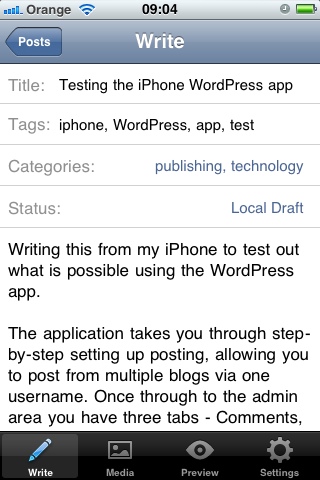 To add media such as the photos above or video, users need to save the post and then select the media tab. Once again the interface is easy to use for anyone familiar with photo applications. (By the way to take a screen-shot on the iPhone press the main centre function button at the same time as the top ‘off’ button.)