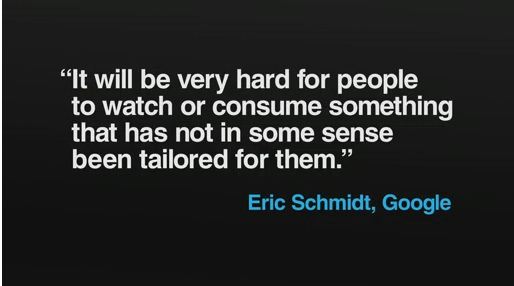 “Most of us assume that when we google a term, we all see the same results – the ones that the company’s famous Page Rank algorithm suggests are the most authoritative based on other pages’ links. But since December 2009, this is no longer true. Now you get the result that Google’s algorithm suggests is best for you in particular – and someone else may see something entirely different. In other words, there is no standard Google any more.”